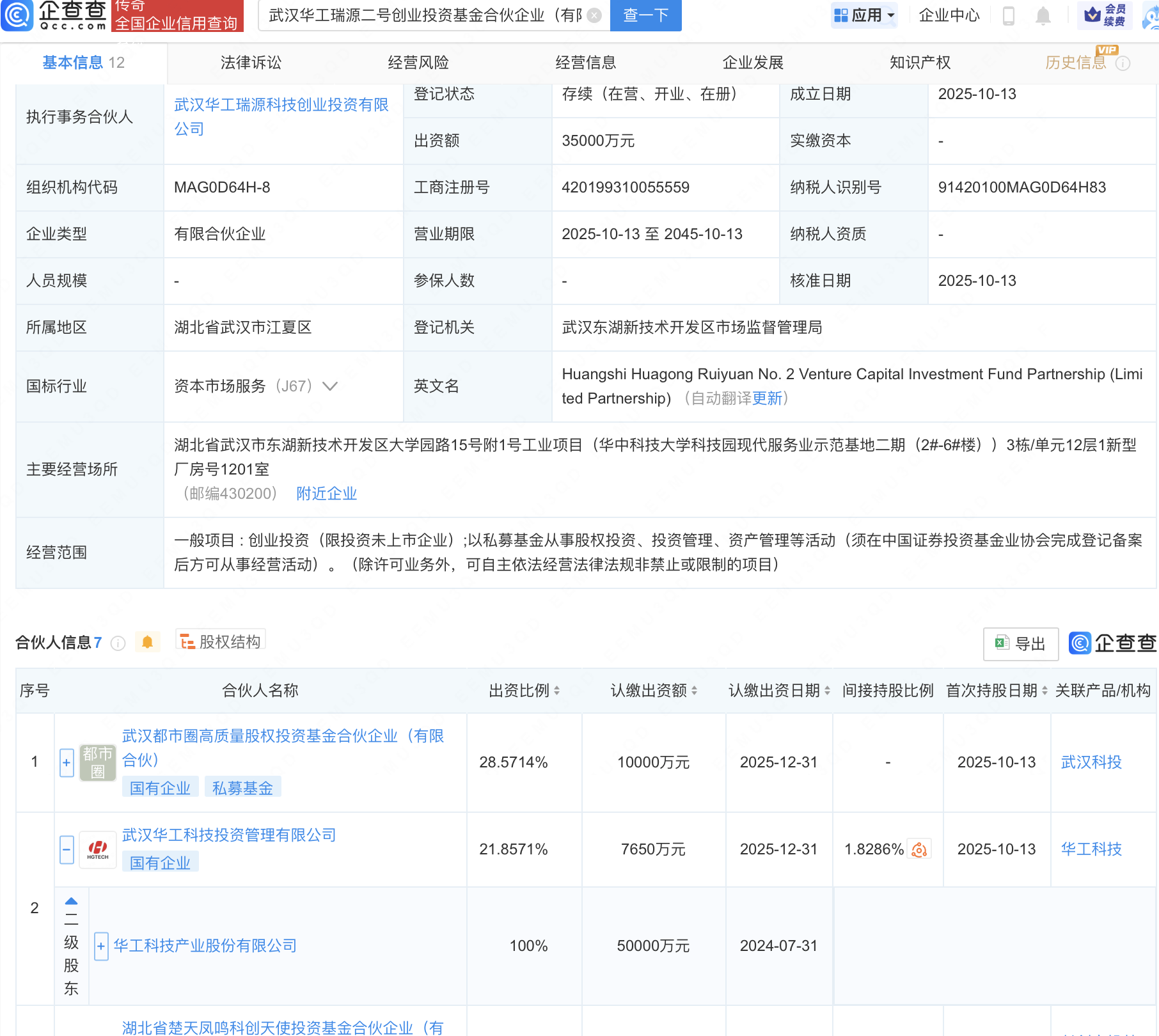 近日,武汉华工瑞源二号创业投资基金合伙企业(有限合伙)成立,出资额3.5亿元,经营范围包含:创业投资(限投资未上市企业);以私募基金从事股权投资、投资管理、资产管理等活动。企查查股权穿透显示,该企业由华工科技(000988)全资子公司武汉华工科技投资管理有限公司等共同出资。